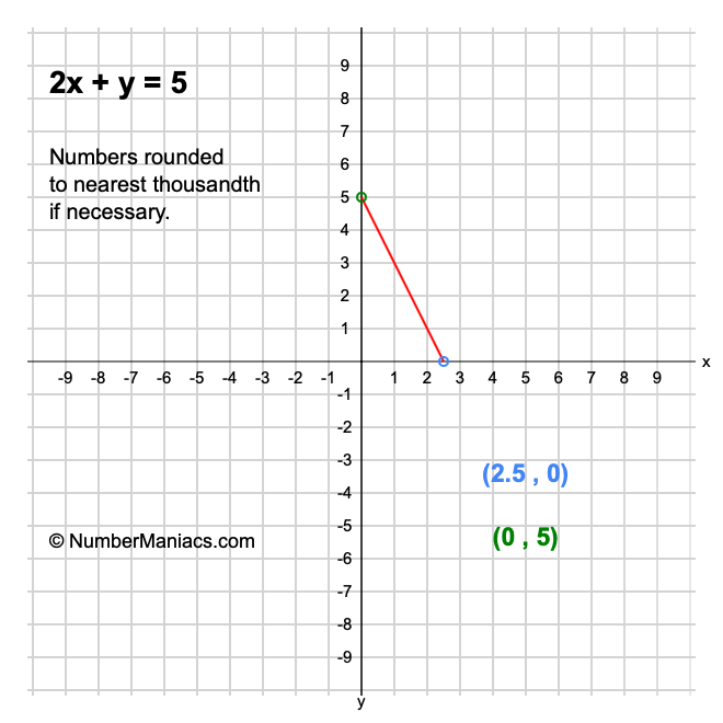 We will start by calculating and showing you the solution for the x-intercept and y-intercept of 2x + y = 5.
