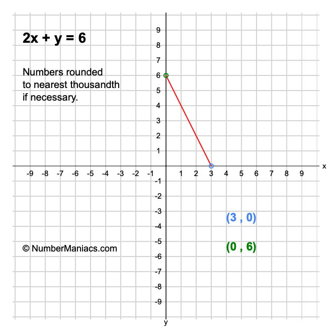 We will start by calculating and showing you the solution for the x-intercept and y-intercept of 2x + y = 6.