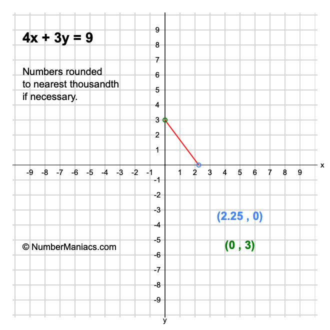 We will start by calculating and showing you the solution for the x-intercept and y-intercept of 4x + 3y = 9.