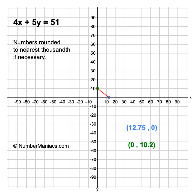 We will start by calculating and showing you the solution for the x-intercept and y-intercept of 4x + 5y = 51.