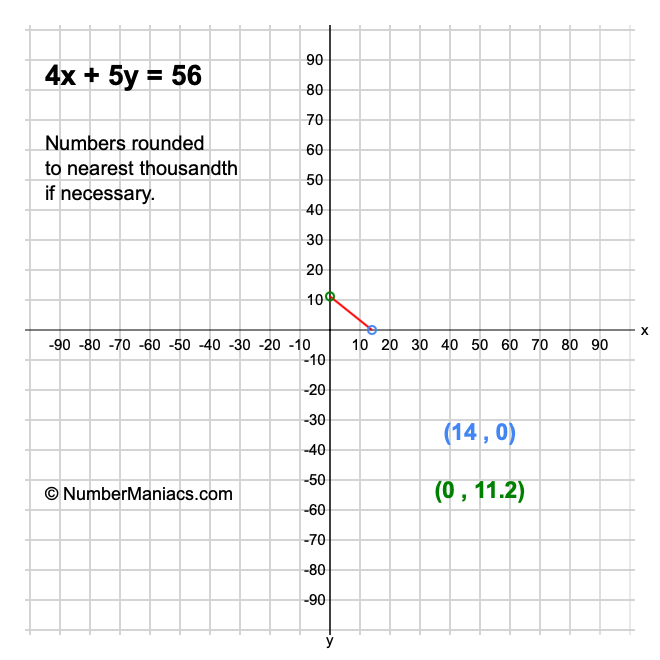 We will start by calculating and showing you the solution for the x-intercept and y-intercept of 4x + 5y = 56.