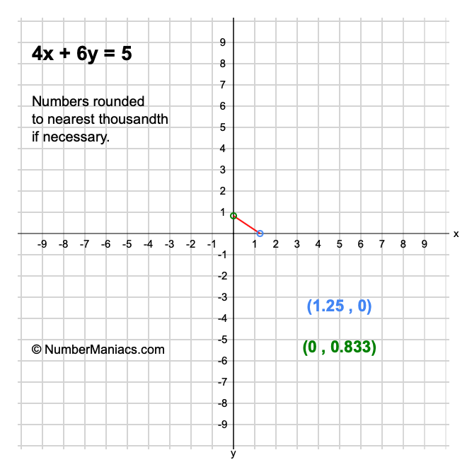 We will start by calculating and showing you the solution for the x-intercept and y-intercept of 4x + 6y = 5.
