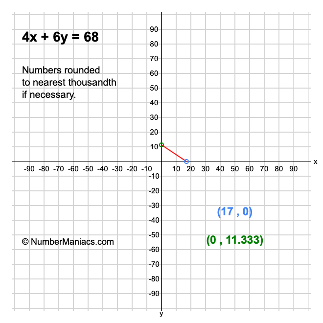 We will start by calculating and showing you the solution for the x-intercept and y-intercept of 4x + 6y = 68.