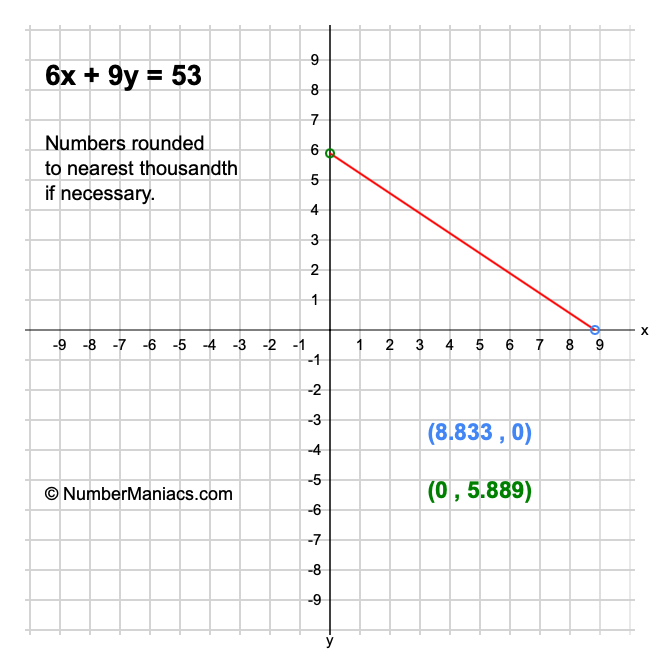 We will start by calculating and showing you the solution for the x-intercept and y-intercept of 6x + 9y = 53.