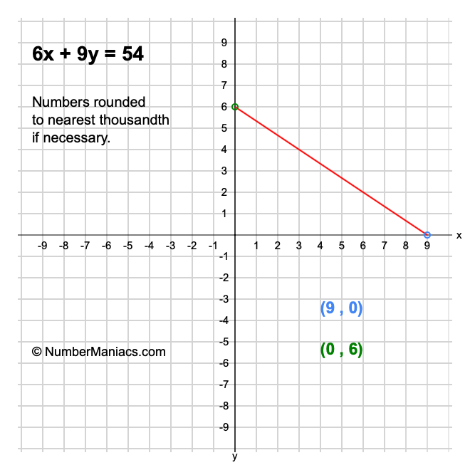 We will start by calculating and showing you the solution for the x-intercept and y-intercept of 6x + 9y = 54.
