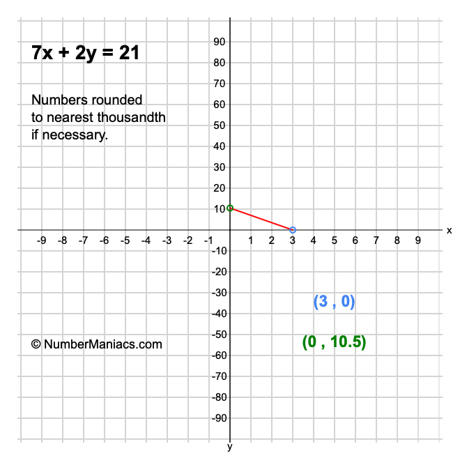 We will start by calculating and showing you the solution for the x-intercept and y-intercept of 7x + 2y = 21.