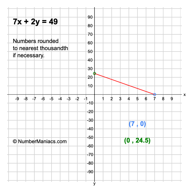 We will start by calculating and showing you the solution for the x-intercept and y-intercept of 7x + 2y = 49.