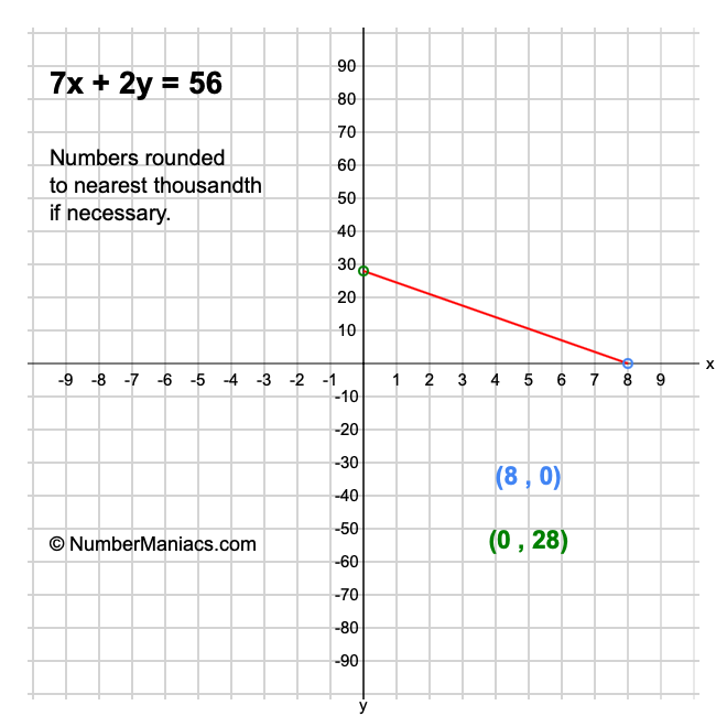 We will start by calculating and showing you the solution for the x-intercept and y-intercept of 7x + 2y = 56.