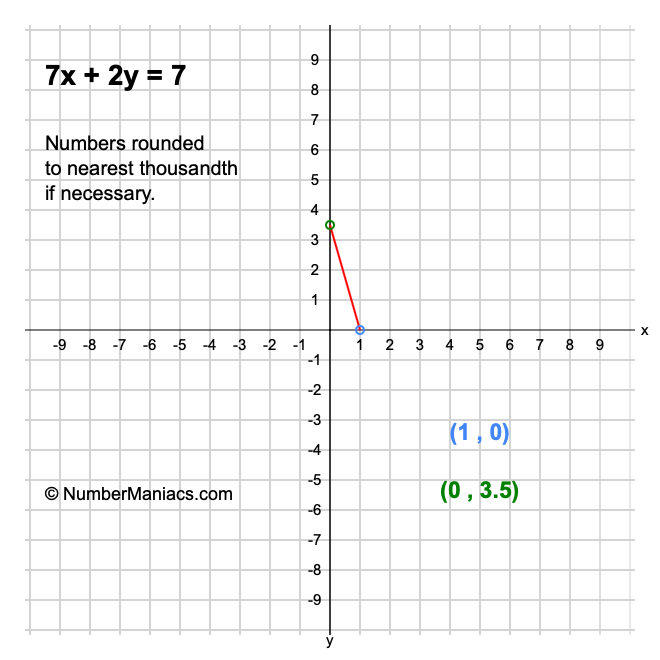 We will start by calculating and showing you the solution for the x-intercept and y-intercept of 7x + 2y = 7.