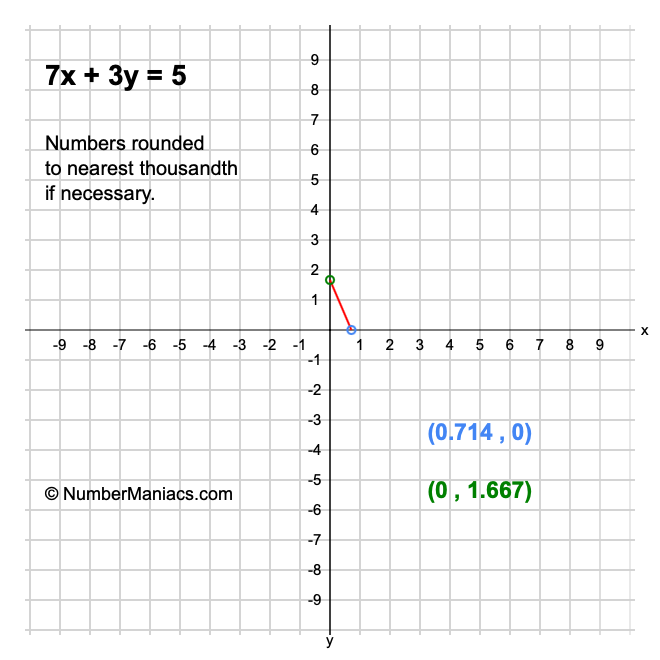 We will start by calculating and showing you the solution for the x-intercept and y-intercept of 7x + 3y = 5.