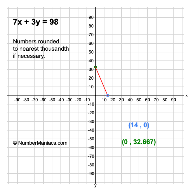 We will start by calculating and showing you the solution for the x-intercept and y-intercept of 7x + 3y = 98.