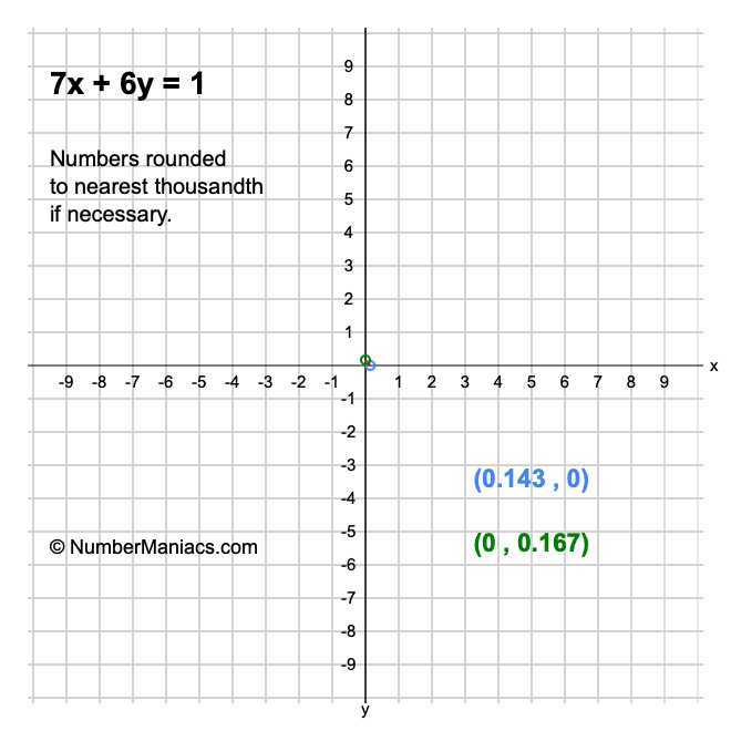 Thus, we use the x-intercept and y-intercept results above to get the graph plots for 7x + 6y = 1 as follows: