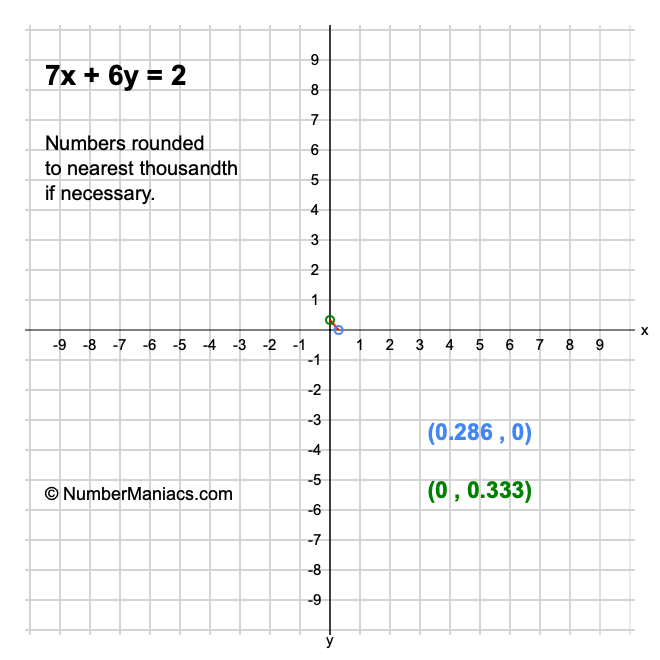 We will start by calculating and showing you the solution for the x-intercept and y-intercept of 7x + 6y = 2.