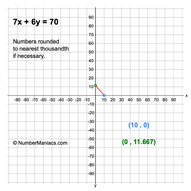 We will start by calculating and showing you the solution for the x-intercept and y-intercept of 7x + 6y = 70.