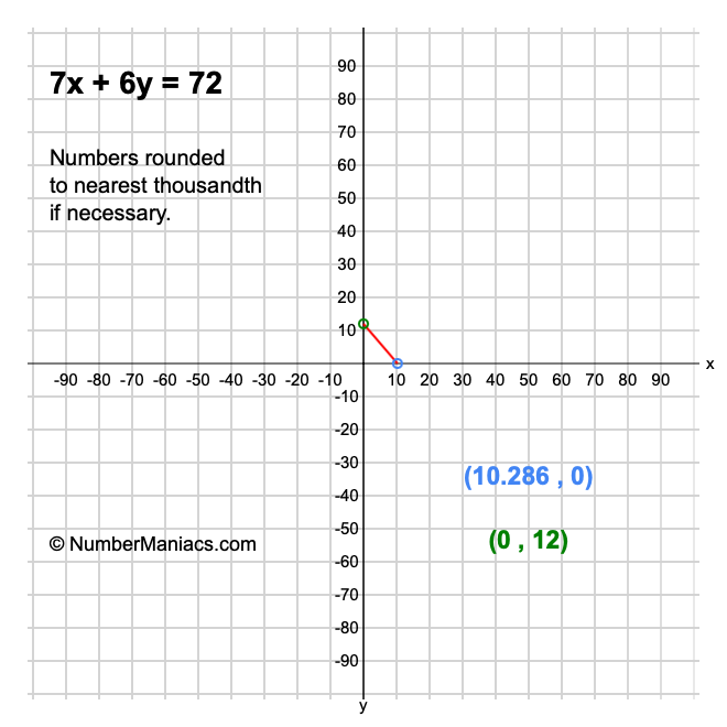 We will start by calculating and showing you the solution for the x-intercept and y-intercept of 7x + 6y = 72.