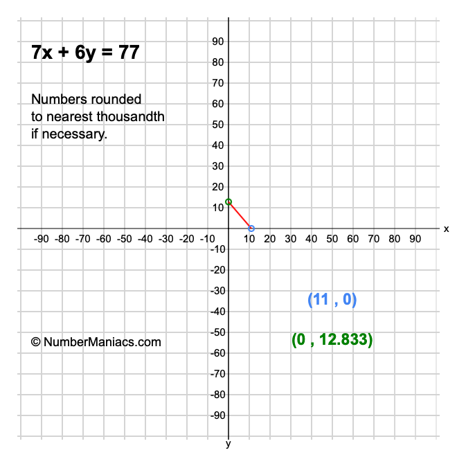 We will start by calculating and showing you the solution for the x-intercept and y-intercept of 7x + 6y = 77.