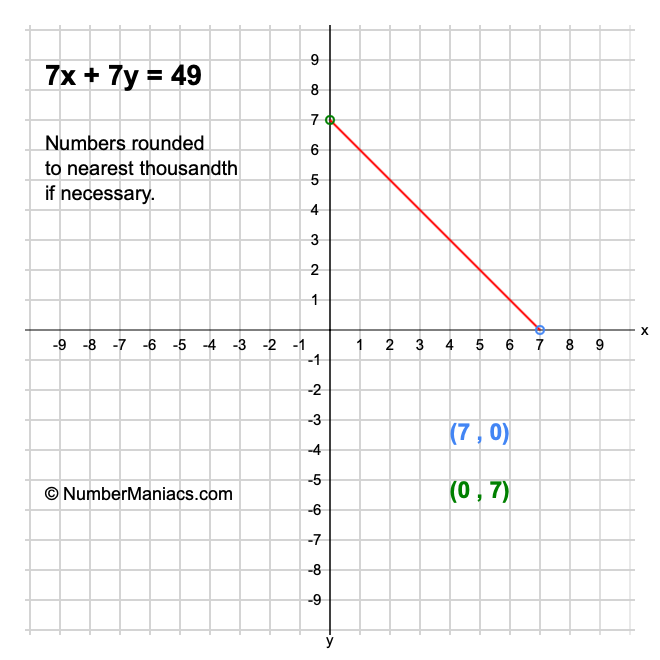 We will start by calculating and showing you the solution for the x-intercept and y-intercept of 7x + 7y = 49.