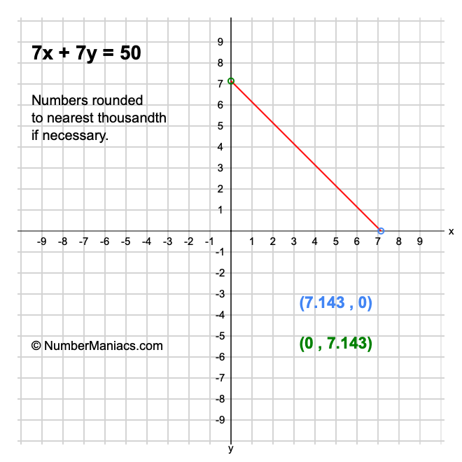 We will start by calculating and showing you the solution for the x-intercept and y-intercept of 7x + 7y = 50.