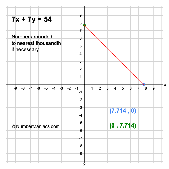 We will start by calculating and showing you the solution for the x-intercept and y-intercept of 7x + 7y = 54.