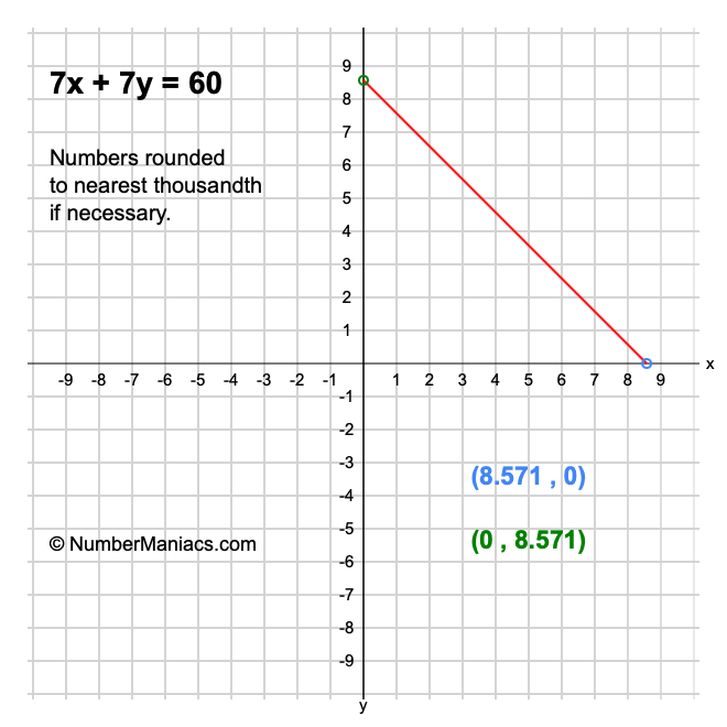 We will start by calculating and showing you the solution for the x-intercept and y-intercept of 7x + 7y = 60.