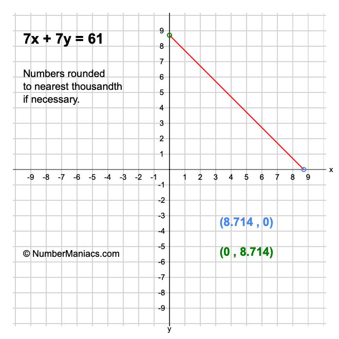 We will start by calculating and showing you the solution for the x-intercept and y-intercept of 7x + 7y = 61.