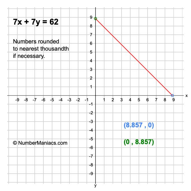 We will start by calculating and showing you the solution for the x-intercept and y-intercept of 7x + 7y = 62.