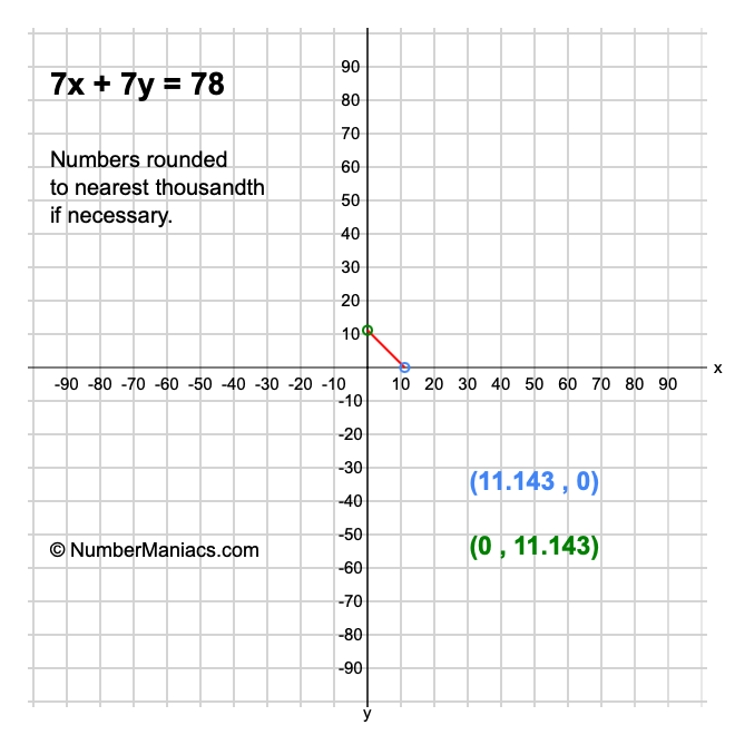 We will start by calculating and showing you the solution for the x-intercept and y-intercept of 7x + 7y = 78.