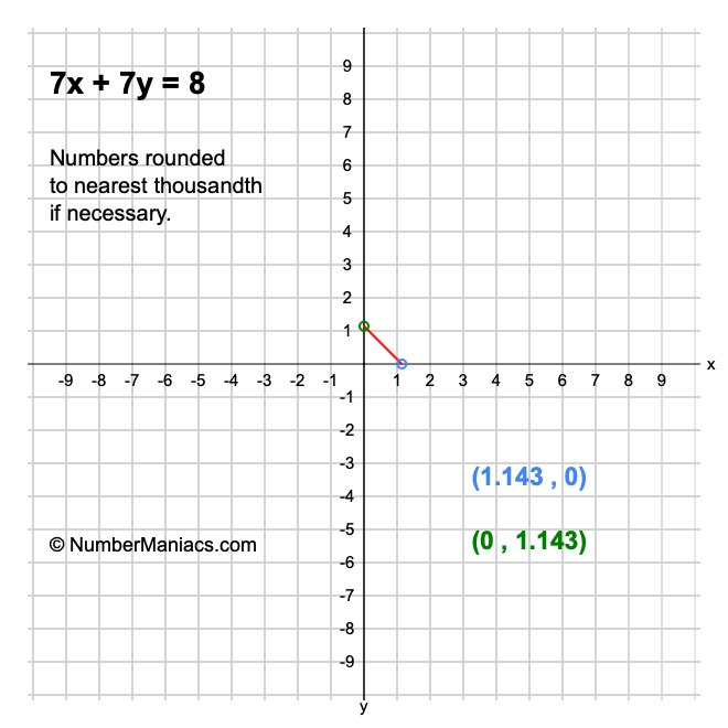 We will start by calculating and showing you the solution for the x-intercept and y-intercept of 7x + 7y = 8.