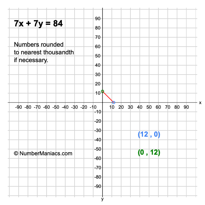 We will start by calculating and showing you the solution for the x-intercept and y-intercept of 7x + 7y = 84.
