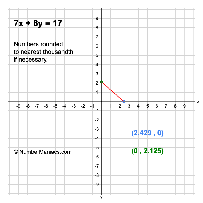 We will start by calculating and showing you the solution for the x-intercept and y-intercept of 7x + 8y = 17.