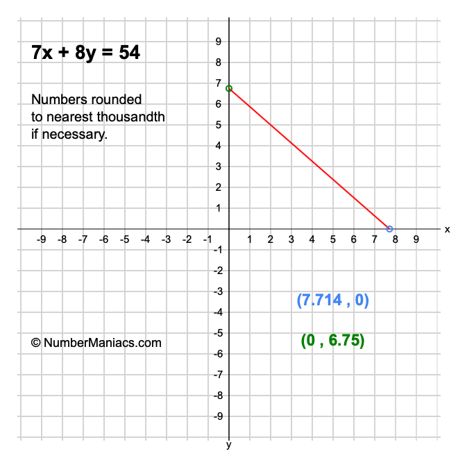 We will start by calculating and showing you the solution for the x-intercept and y-intercept of 7x + 8y = 54.