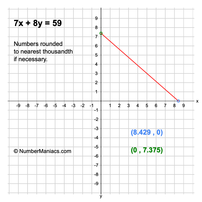 We will start by calculating and showing you the solution for the x-intercept and y-intercept of 7x + 8y = 59.