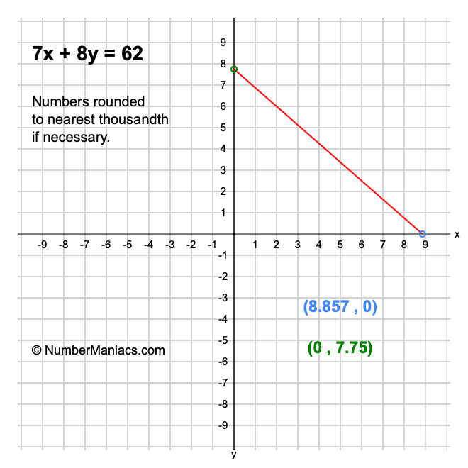 We will start by calculating and showing you the solution for the x-intercept and y-intercept of 7x + 8y = 62.