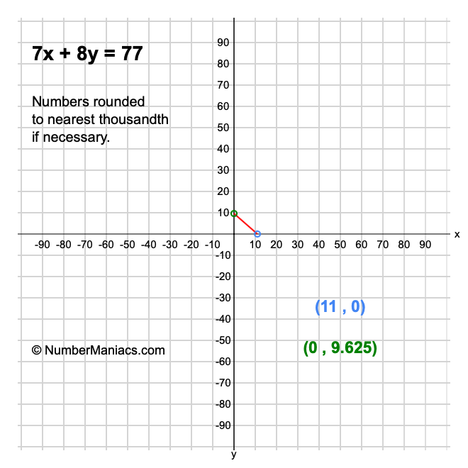 We will start by calculating and showing you the solution for the x-intercept and y-intercept of 7x + 8y = 77.