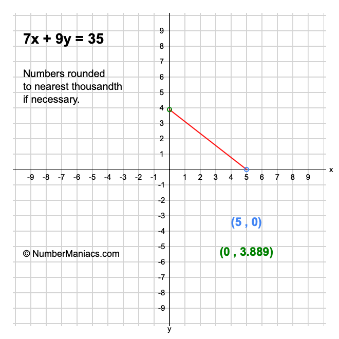 We will start by calculating and showing you the solution for the x-intercept and y-intercept of 7x + 9y = 35.