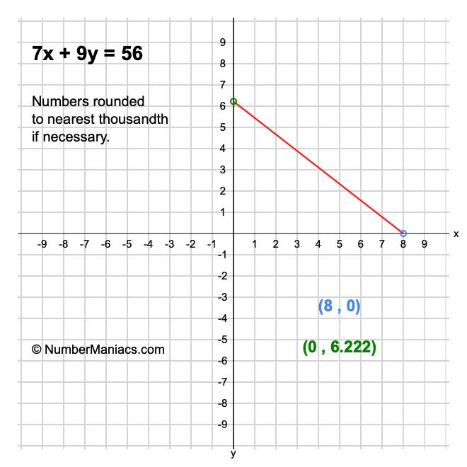 We will start by calculating and showing you the solution for the x-intercept and y-intercept of 7x + 9y = 56.