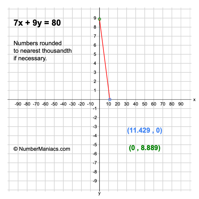 We will start by calculating and showing you the solution for the x-intercept and y-intercept of 7x + 9y = 80.