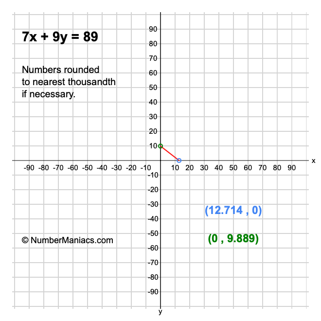 We will start by calculating and showing you the solution for the x-intercept and y-intercept of 7x + 9y = 89.