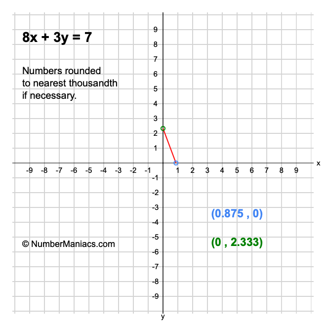We will start by calculating and showing you the solution for the x-intercept and y-intercept of 8x + 3y = 7.