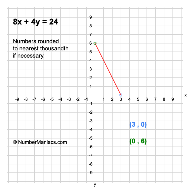 We will start by calculating and showing you the solution for the x-intercept and y-intercept of 8x + 4y = 24.