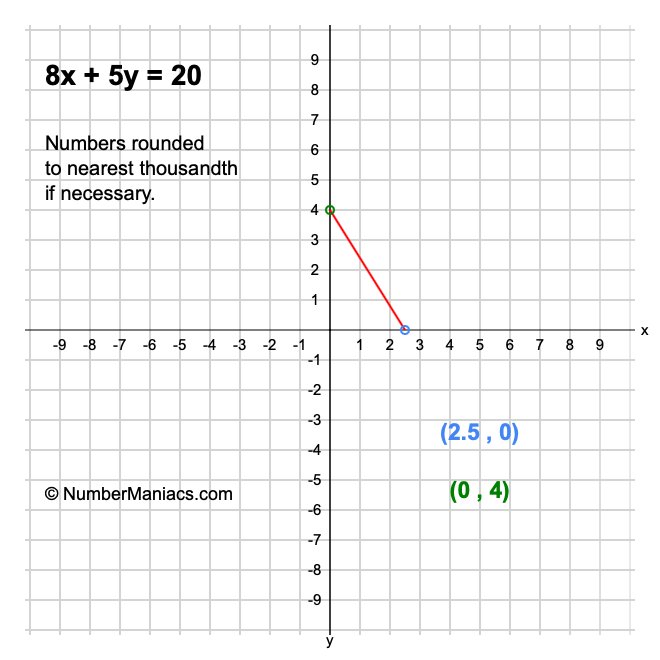 We will start by calculating and showing you the solution for the x-intercept and y-intercept of 8x + 5y = 20.