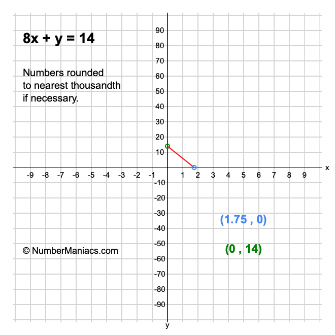 We will start by calculating and showing you the solution for the x-intercept and y-intercept of 8x + y = 14.