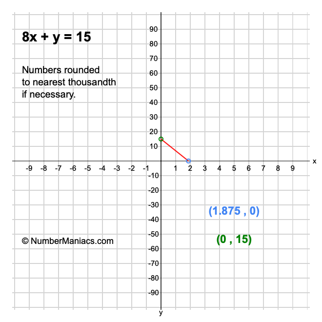 We will start by calculating and showing you the solution for the x-intercept and y-intercept of 8x + y = 15.