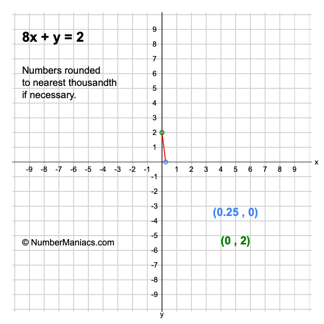 We will start by calculating and showing you the solution for the x-intercept and y-intercept of 8x + y = 2.
