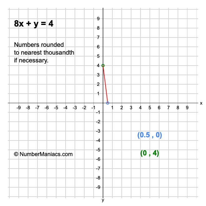 We will start by calculating and showing you the solution for the x-intercept and y-intercept of 8x + y = 4.