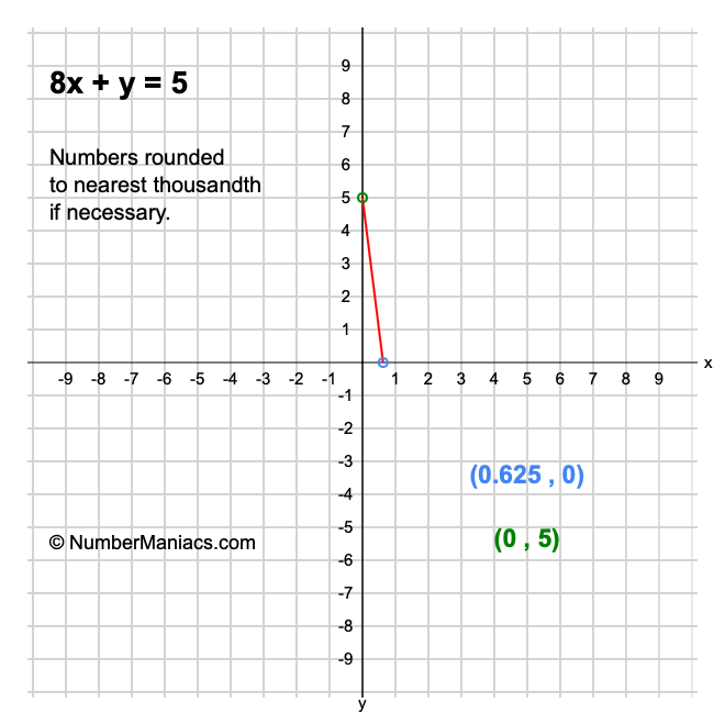 We will start by calculating and showing you the solution for the x-intercept and y-intercept of 8x + y = 5.