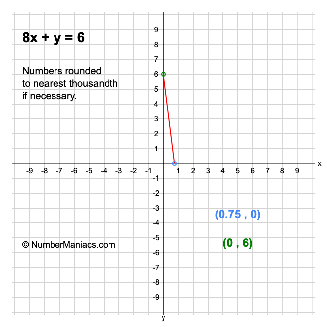 We will start by calculating and showing you the solution for the x-intercept and y-intercept of 8x + y = 6.