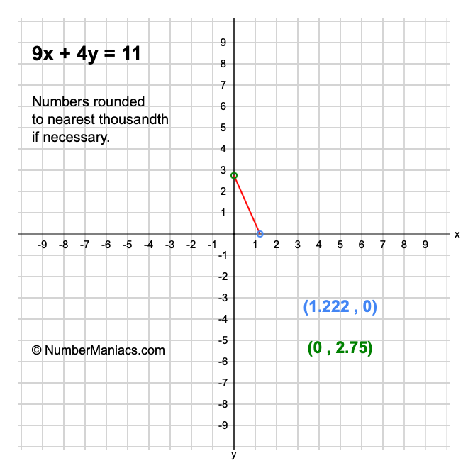 We will start by calculating and showing you the solution for the x-intercept and y-intercept of 9x + 4y = 11.