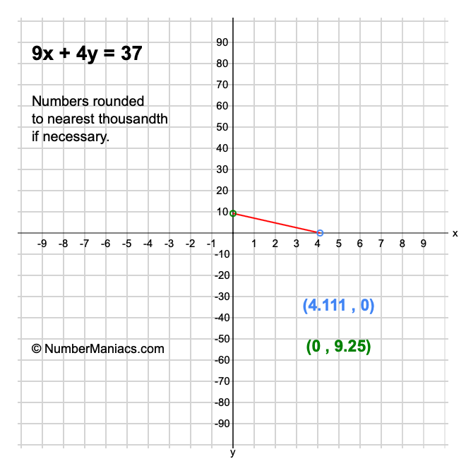 We will start by calculating and showing you the solution for the x-intercept and y-intercept of 9x + 4y = 37.
