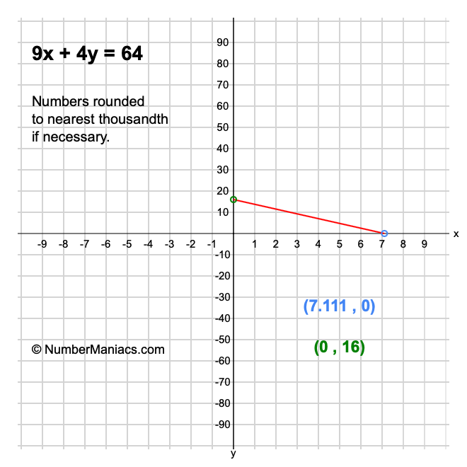 We will start by calculating and showing you the solution for the x-intercept and y-intercept of 9x + 4y = 64.